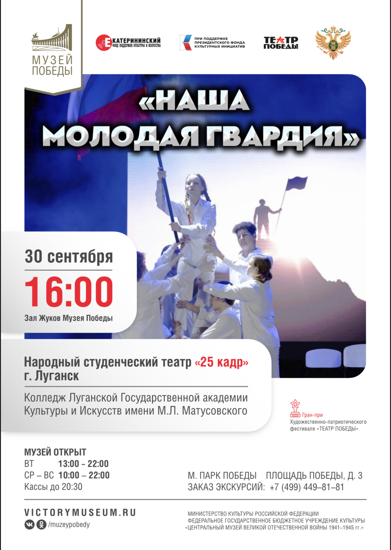 30 сентября в 16.00 в зале Жуков Музея Победы состоится торжественное открытие фестиваля патриотических постановок "Театр Победы", и стартует фестиваль с показа спектакля "Наша молодая гвардия" народного студенческого театра "25 кадр" г. Луганска. В спектакле принимают участие студенты колледжа Луганской государственной академии культуры и искусств имени М. Л. Матусовского. Режиссер-постановщик: Ольга Курилова.